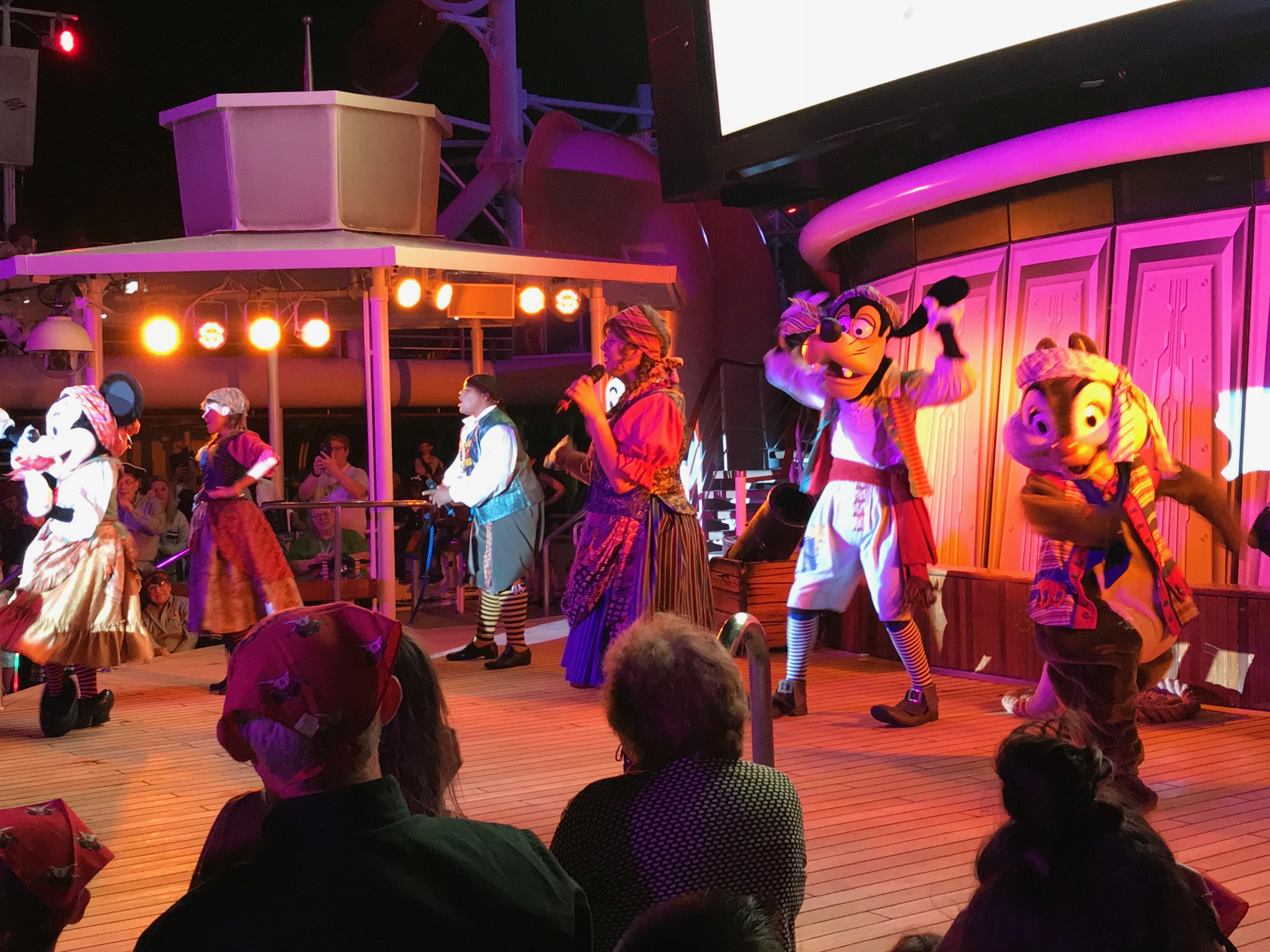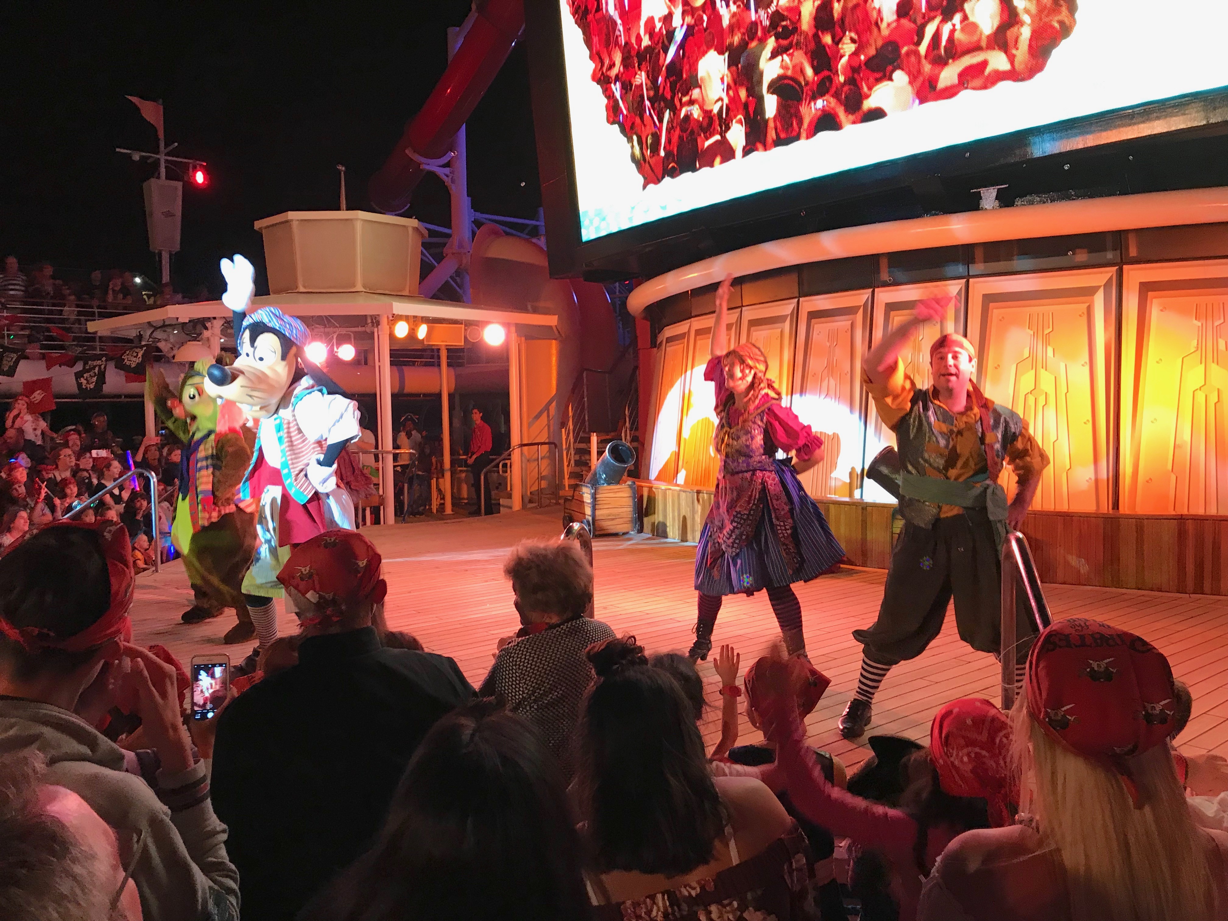 But, the fun was only beginning…it was time to go up on Deck 9 for the Pirates In the Caribbean Deck Party! We never attended the Pirate Night party on the Disney Dream. Since we already were missing bedtime by a long shot every night of this cruise, we thought, “what the heck?” So, we went up on deck, outdoors under the Caribbean stars, to see what all the fuss was about.