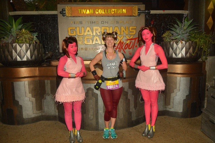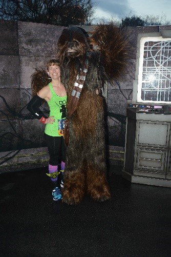 The morning of the 5K was a chilly one (in California terms anyway). I walked from my Disneyland good neighborhood hotel with my knee-high Yoda socks, as his ears flapped with each step, and quickly found my corral to huddle in with the masses. From the moment my feet crossed that start line, I was hooked. The 5K route first entered the parks through a back entrance of California Adventure. Our first real peek of the parks was the Cadillac Mountain Range of Cars Land. I’ll admit I got a little teary-eyed. And, that wouldn’t be the only time. The race ended near the Disneyland Hotel, just after running through Sleeping Beauty’s Castle and a quick photo stop with Chewbacca. I had a permanent smile plastered to my face. Thus began my obsession with runDisney.