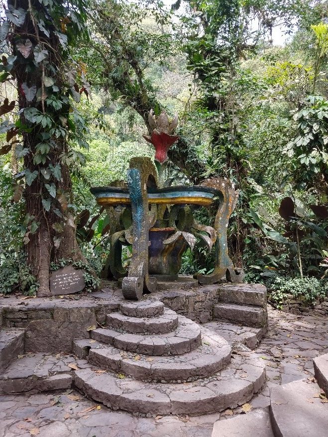 On Saturday morning, we left early for the almost two-hour drive to the Edward James Sculpture Garden in Xilitla. Rumor has it that Edward James’ godfather, the Prince of Wales (who later became the King of England, ie., Edward VII), was his real father. In any event, he inherited a fortune, became a patron of the arts, and decided to build this weird surrealist garden in the middle of the jungle in Mexico, inspired by Picasso, Dali, and other avant garde artists of the period, many whom he knew personally. The gardens only allow 800 people in at any one time, and the entire group must line up together to purchase tickets. The adult entry fee is under $4USD, and the guides inside are worth the $250MXN/$13USD price for a group tour. While waiting in line, we bought homemade tamales, gorditas with red chili, fruit sherbets, mango and lime fruit waters, and little bags of local hand-harvested coffee, freshly roasted and ground.