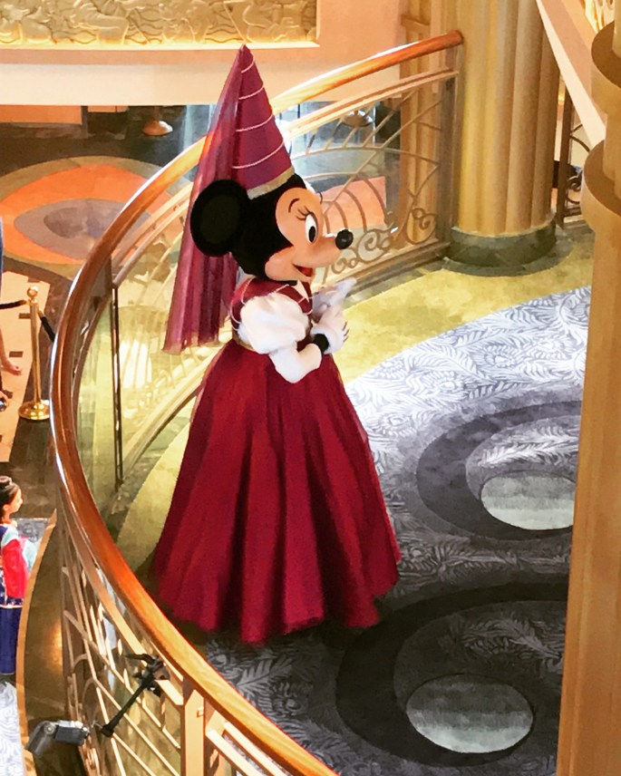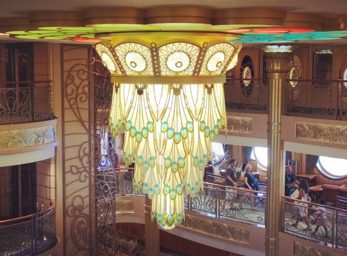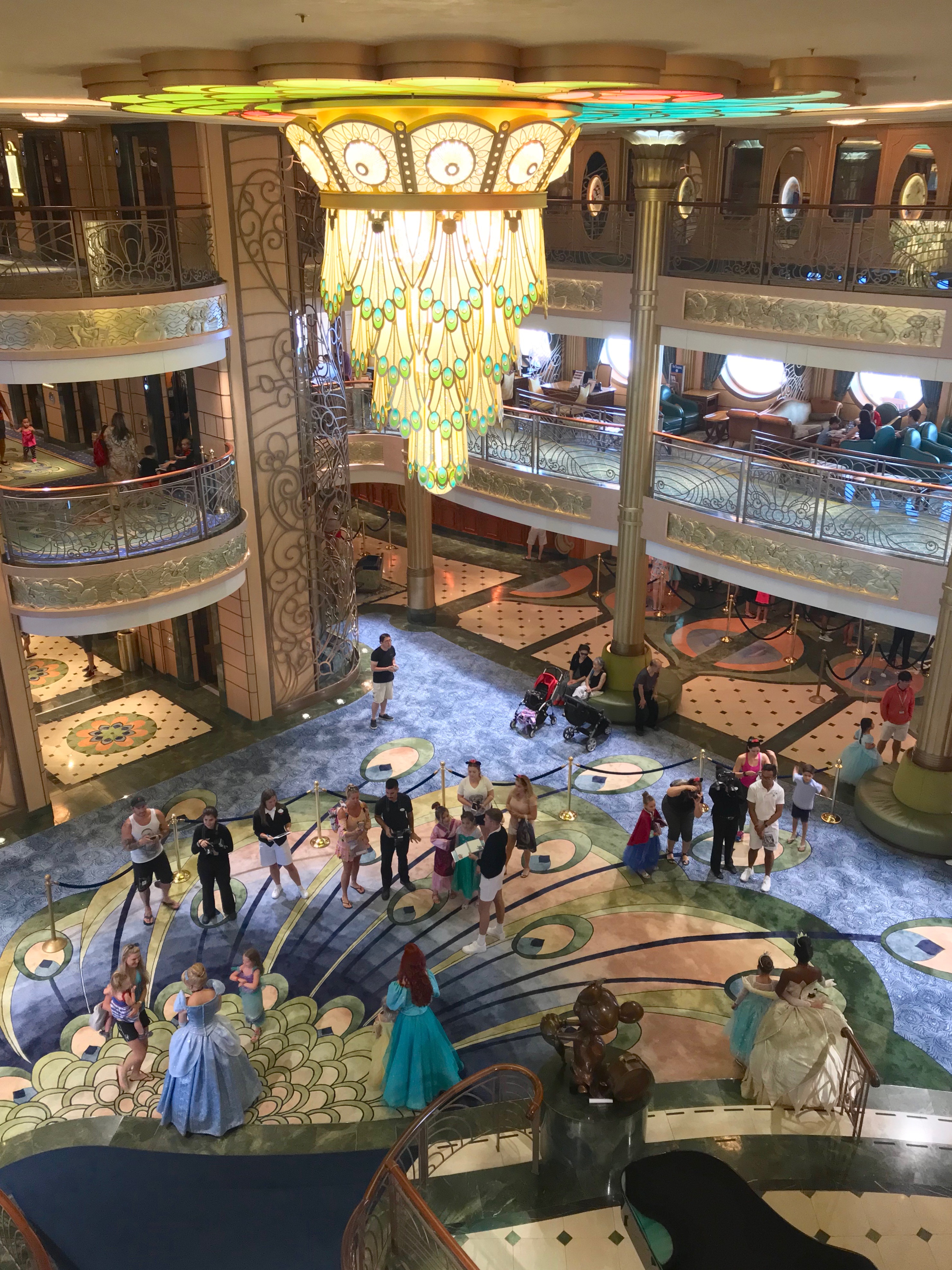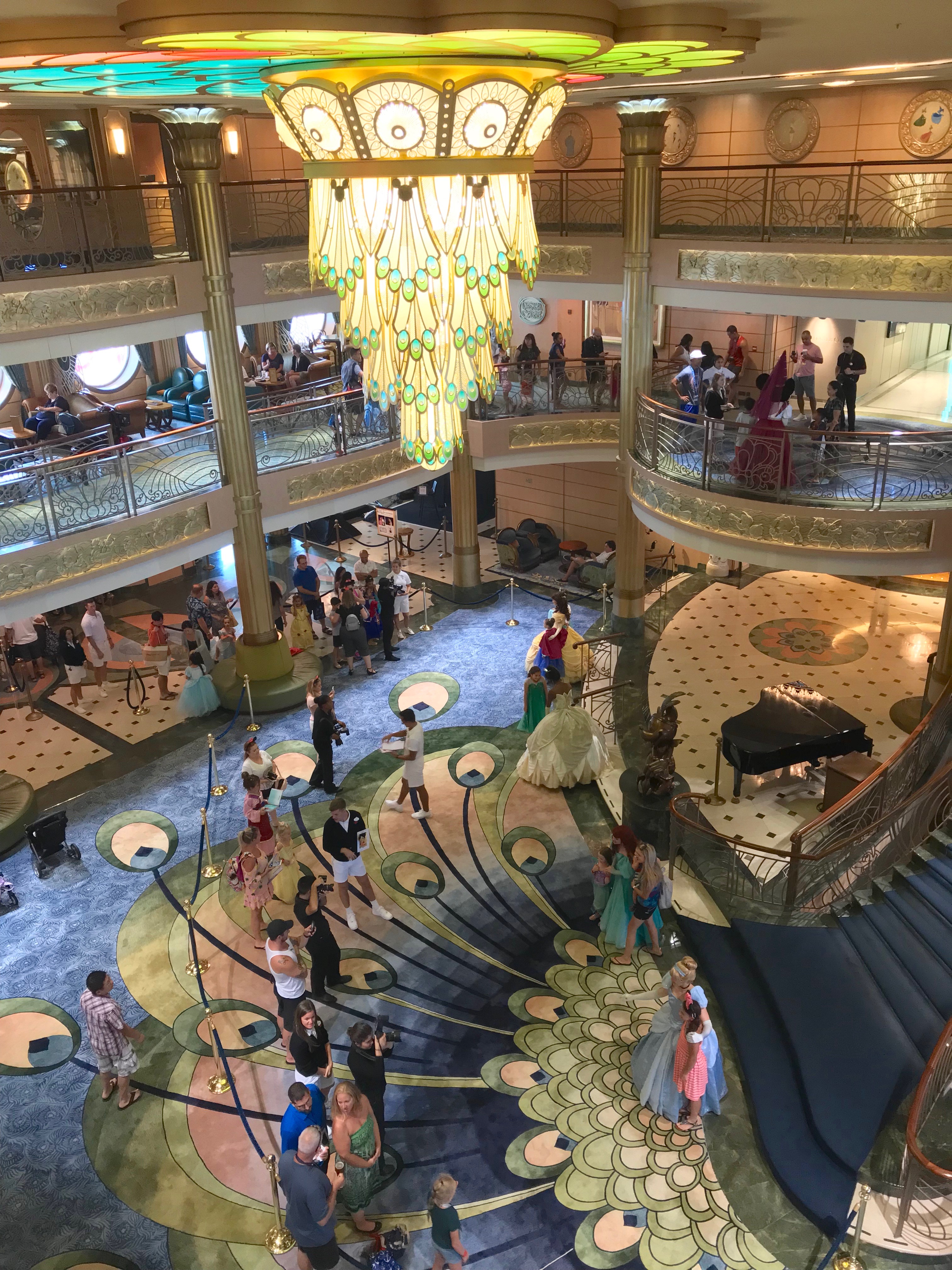 We then headed over to my favorite spot on the ship, the lobby atrium. I absolutely love the Fantasy’s lobby atrium and couldn’t seem to get enough photos of the pastel colors and peacock themed Art Nouveau décor. And, there happened to be a Princess meet and greet taking place: