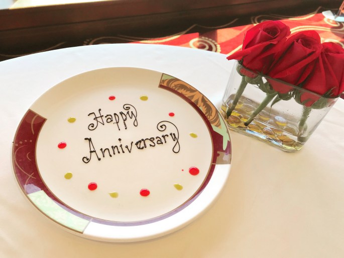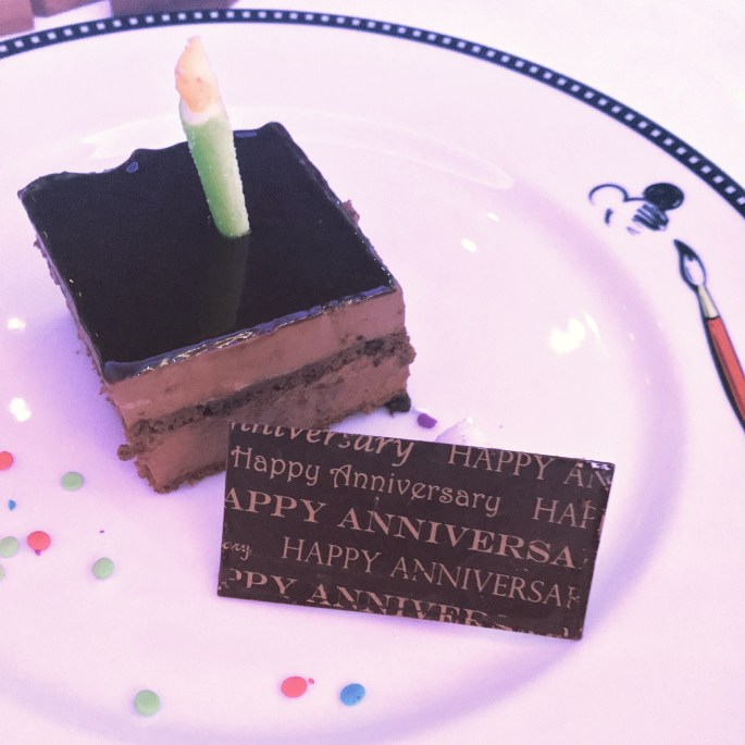 I had over twenty desserts that day, but that didn’t stop our wait staff from surprising us with even more! Yep, it was “happy anniversary” time à la chocolate cake: