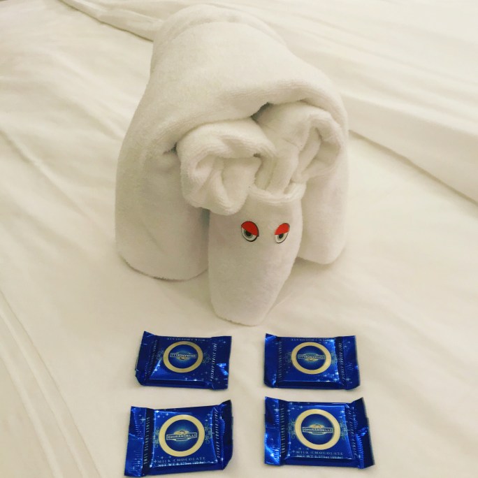 We were ready to retire to our stateroom for the night, as we had an early start the next day for our Tortola Port Adventure. But, first, the towel elephant in our stateroom had to offer us chocolates (no more dessert – please make it stop!!!): it’s the Disney way.