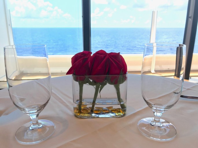 We were seated in a cozy, corner booth with a straight-on view of the sea. It was super-romantic! One thing I would note, though, is that on the Disney Fantasy, Goofy’s Sports Deck is right above Palo, so we periodically heard basketballs bouncing on the ceiling. Nothing too crazy, but the ambience was not necessarily perfect.