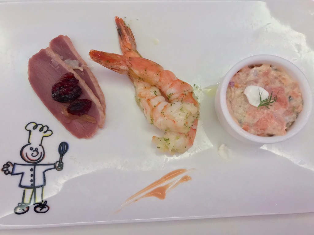 From left to right, the sampler was comprised of smoked duck breast with picked red onions and dried cranberries, dill-marinated shrimp with tomato-mayonnaise, and smoked salmon tartar with sour cream and cream cheese. My favorite was the shrimp.