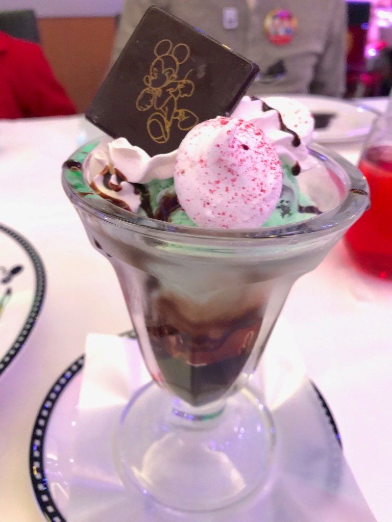 Following the show, it was time for dessert. As usual, I couldn’t resist temptation and ordered two desserts (again): the chocolate lava cake (served with chocolate sauce and vanilla ice cream) and the “Captain’s” sundae (mint chocolate chip ice cream with chocolate sauce, whipped cream, and crunchy meringue):
