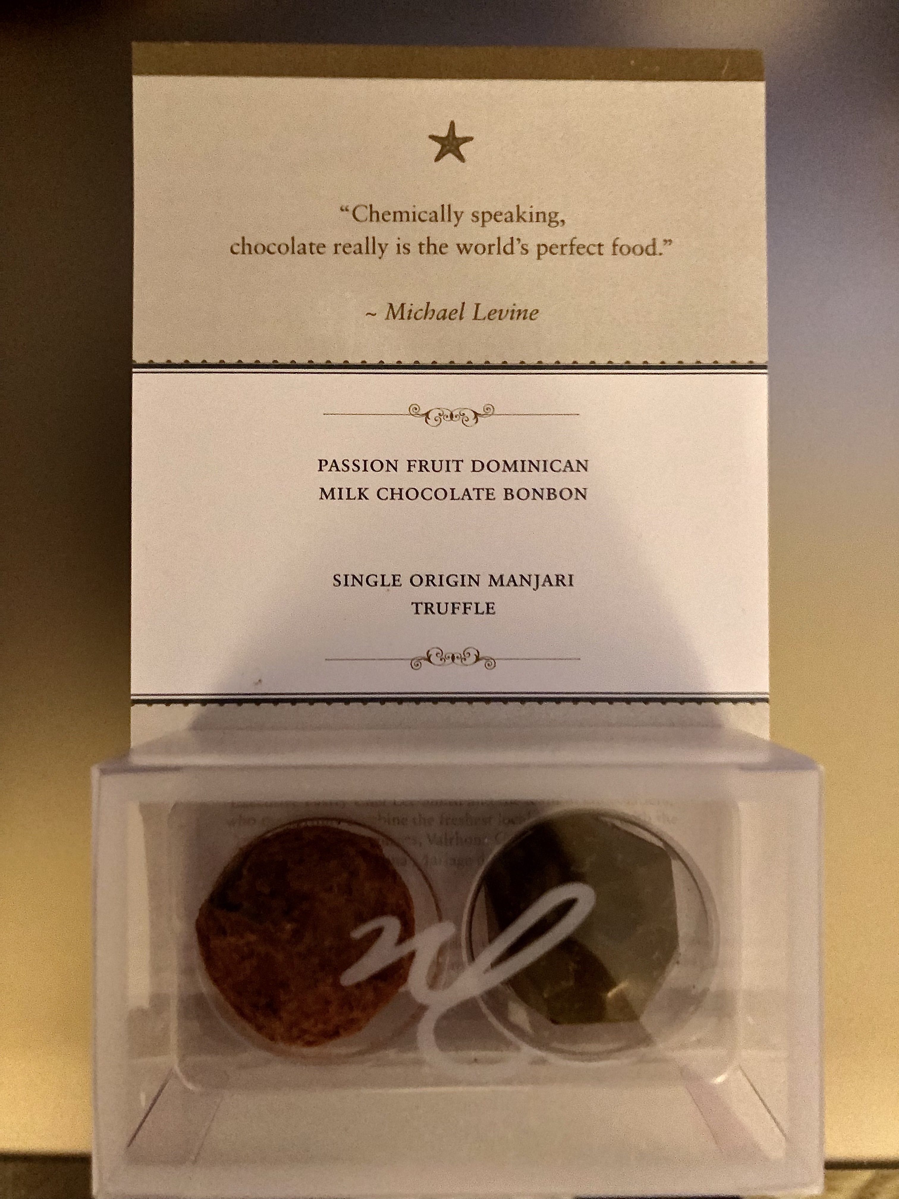 Our stay included daily turndown service. We received complimentary bottled waters and gourmet chocolates (made on-site!):
