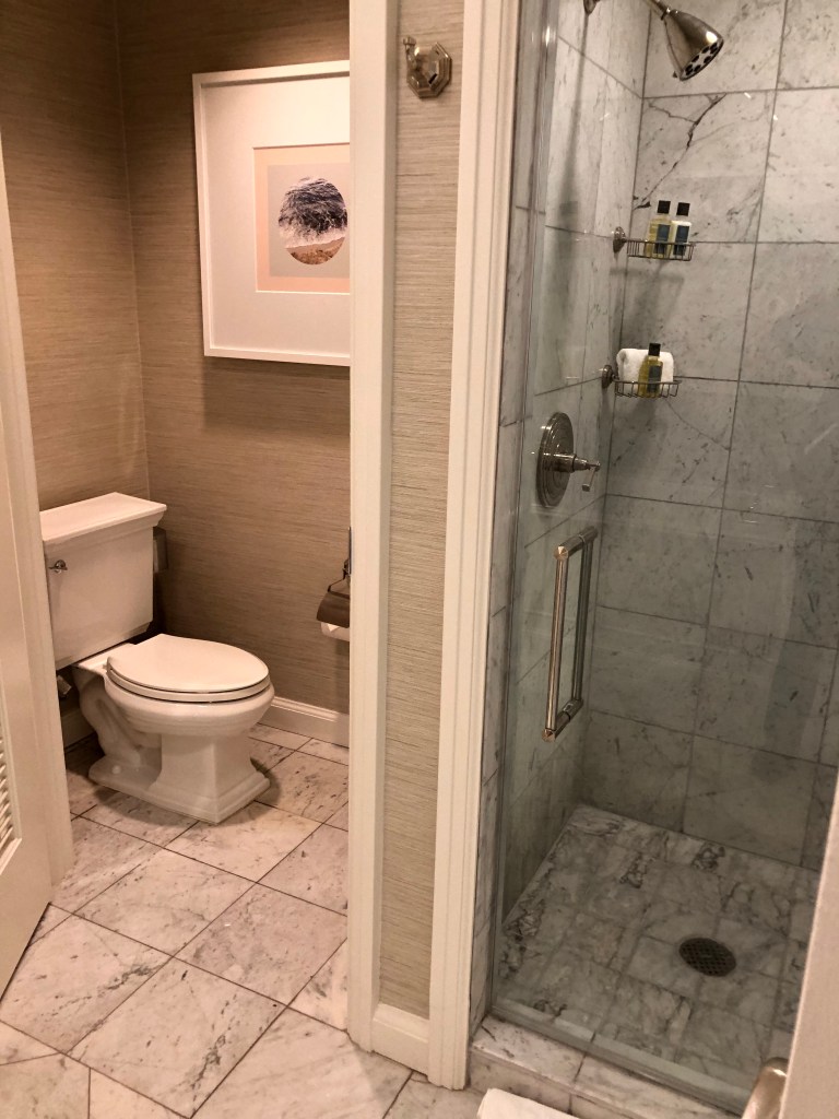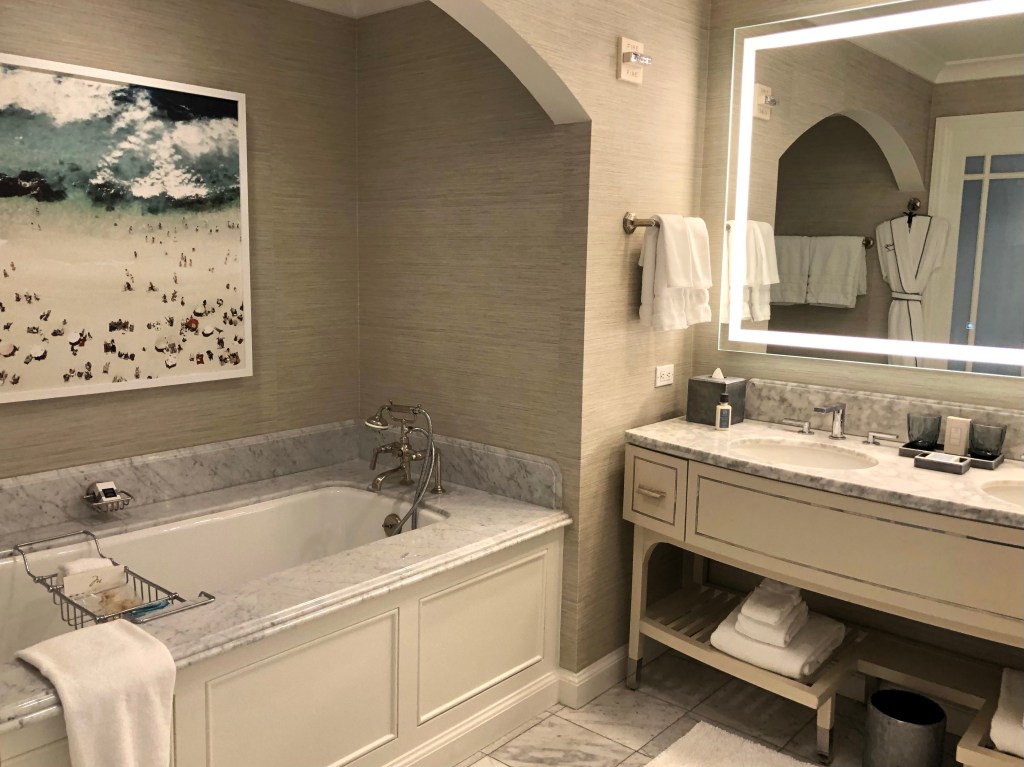 Our room was very spacious at 500 square feet, decorated in light airy tones, with a luxrious marble bathroom that included double vanities, a large soaking tub, and a separate shower and toilet area. Here are some photos of the sparkling bathroom: